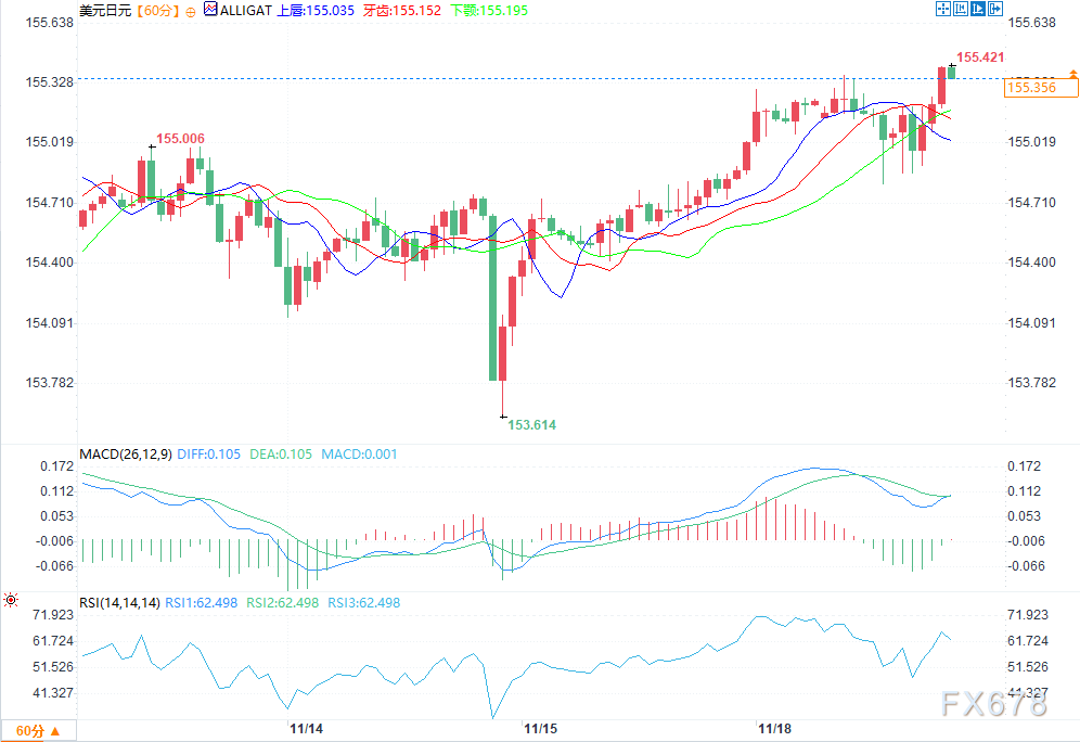 受日本三季度疲软GDP数据拖累,日元承压,美元兑日元汇率持续上行并站稳155关口上方。