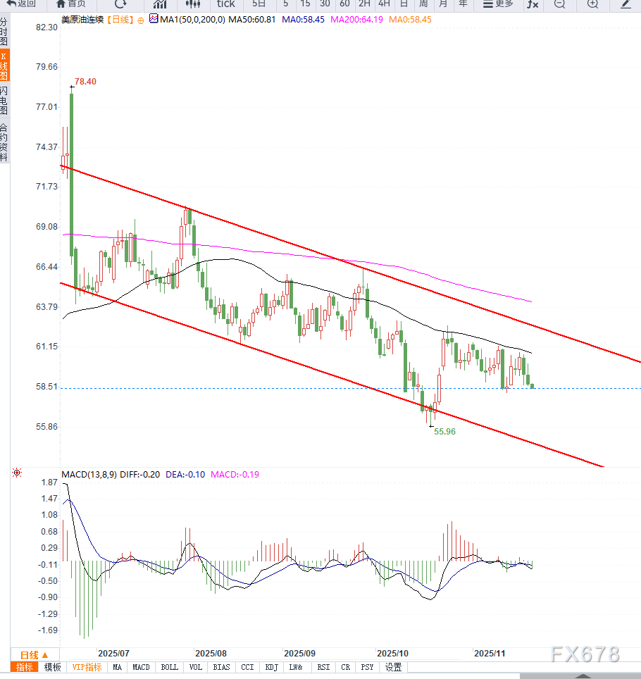 与此同时,14日RSI指标保持在中性偏弱区域,反映买盘动能不足,趋势性力量仍未形成有效反转。若后续价格跌破近期重要支撑位约58.00美元,可能触发进一步的下探空间;反之,若意外突破60.8—61美元上方压力区,才有机会扭转当前偏空结构。