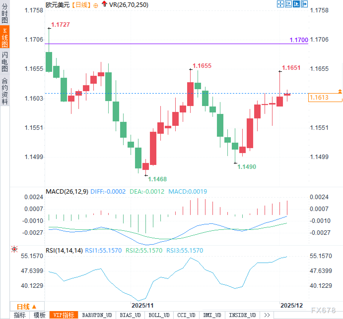 日线图显示,欧元兑美元自触及1.1468低点后展开修复行情;当前价格运行于1.1613附近,恰好位于前期震荡区间的中枢地带。
