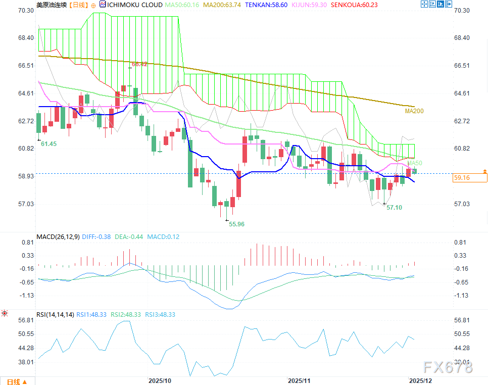 汇通财经APP讯——周二(12月2日)欧盘时段,WTI原油价格小幅走低,分时图呈现出日内 “冲高回落 + 低位震荡” 的走势特征:亚市早盘价格一度冲高至 59.67 附近,随后伴随空头力量释放持续震荡下行,期间多次下探并在 59.10 一线形成短期支撑,当前价格小幅反弹至 59.20附近。