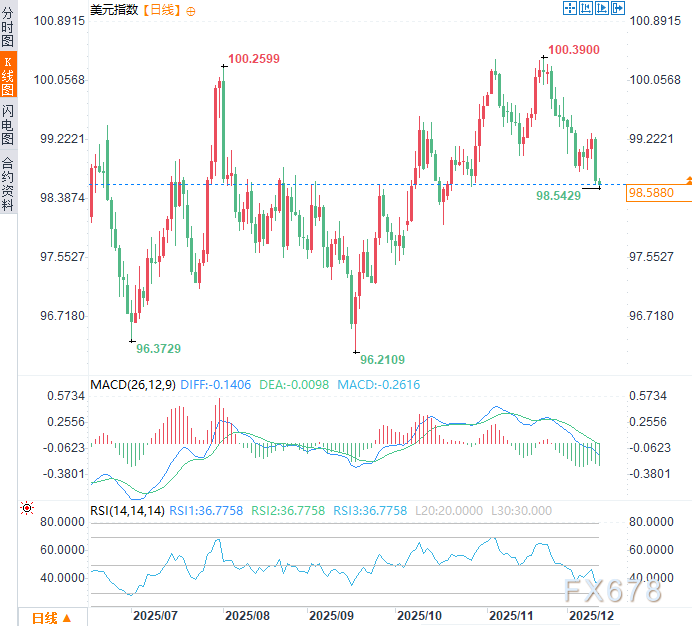 综合来看,特朗普的言论及相关事态在短期内对美元的影响偏向负面,主要是通过压低利率预期和损害美联储信誉这两个核心渠道。周四美元指数延续前一交易日下行趋势,跌幅约0.09%,亚市早盘时段一度触及98.54的近八周低点。